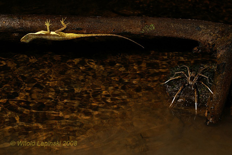 Ancylometes bogotensis adult male beside a sleeping Norops oxylophus, Tirimbina, Costa Rica © W. Lapinski